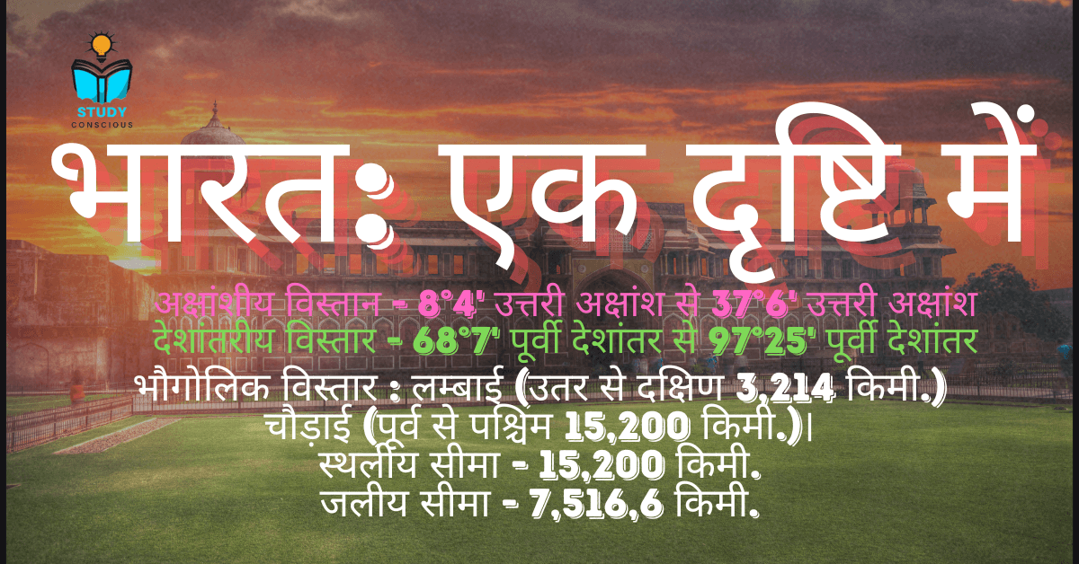भौगोलिक विस्तार : लम्बाई (उतर से दक्षिण 3,214 किमी.)